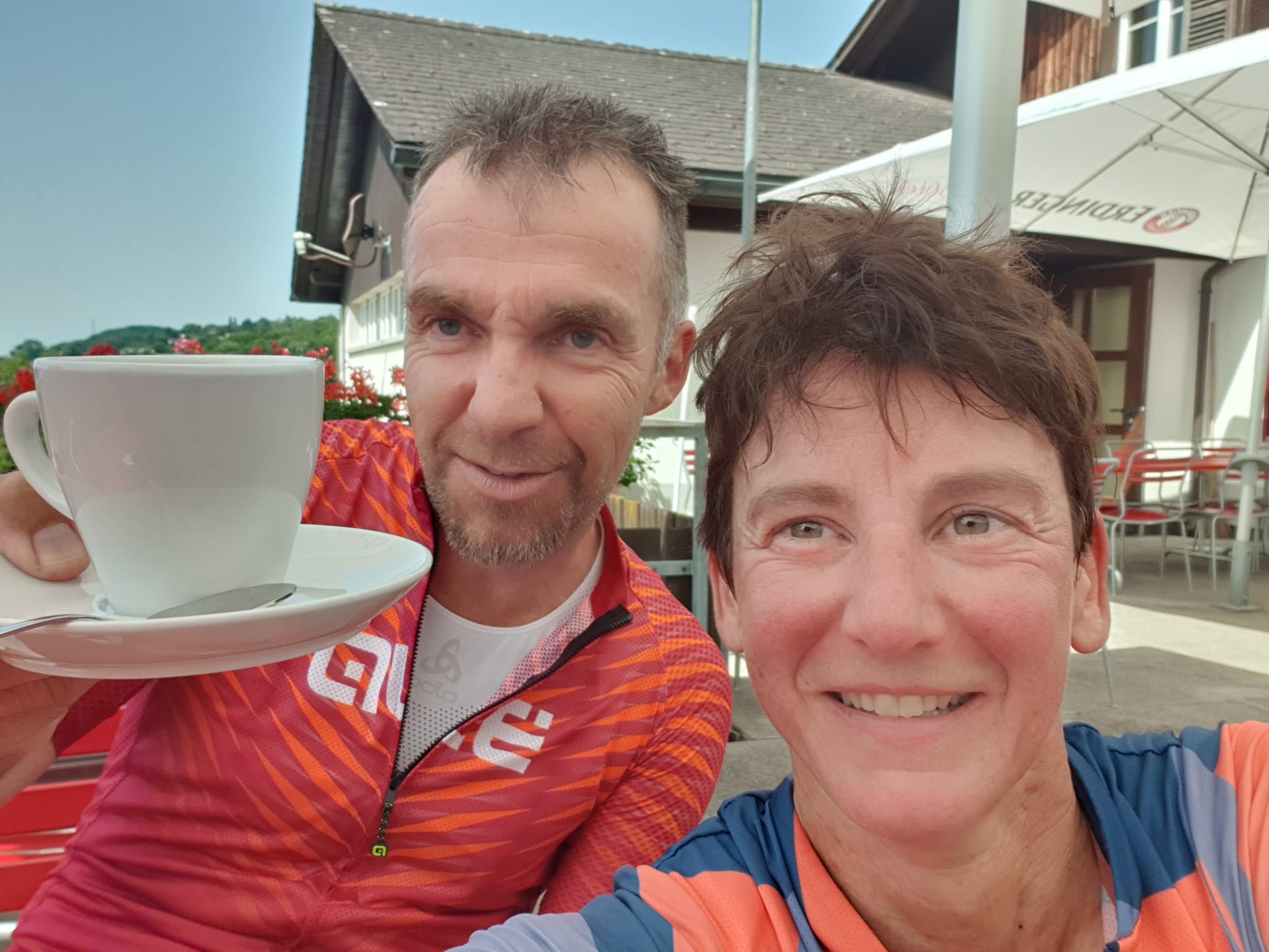 Nach dem längsten Anstieg bei etwa Rennhälfte machten wir halt in einer Gartenwirtschaft um unseren überfälligen und wohlverdienten Kaffee einzunehmen. Wir sprachen schon seit Kilometern davon “….jetzt machen wir dann einen Kaffeehalt …” … es dauert aber etwas länger 😉