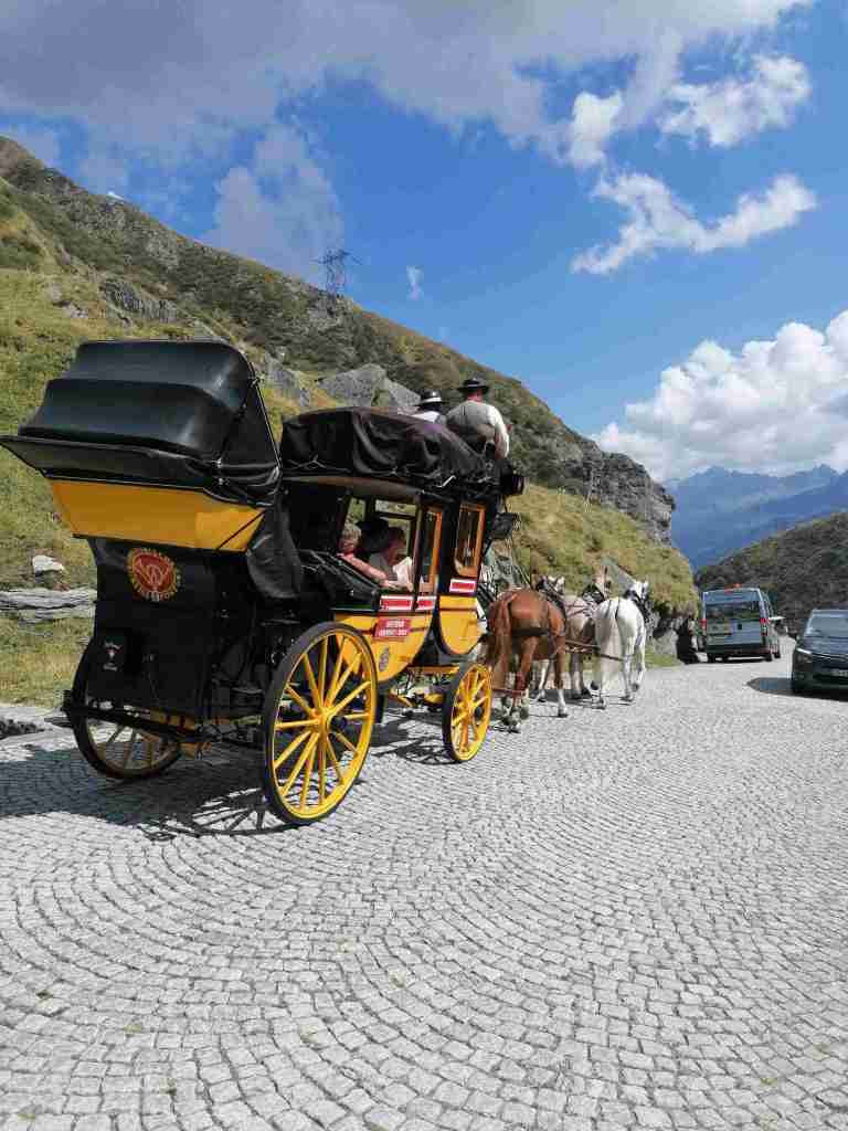 Nach einem Teller Spaghetti geht es weiter die alte Tremola hoch über Pflastersteine. Kurz vor Passhöhe kam mir die legendäre Gotthardpost (Kutsche) entgegen.