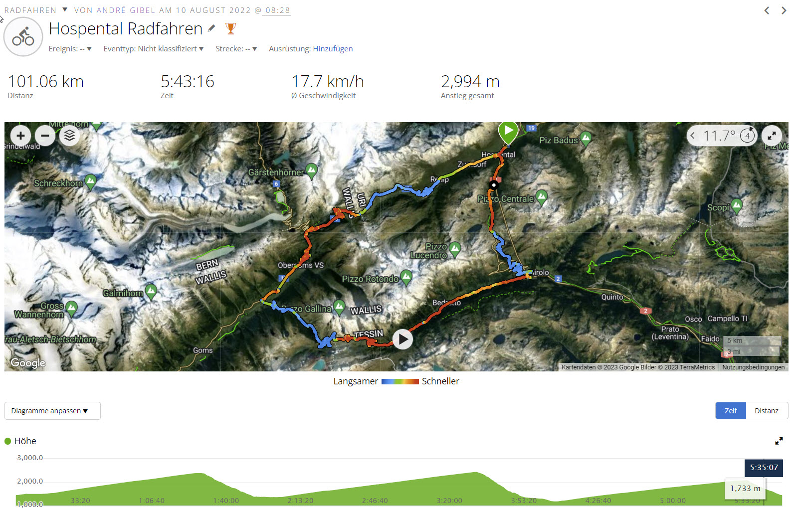Auf der Passhöhe gab es eine kurze Trinkpause bevor es wieder Richtung Hospental zu meinem Auto zurück ging. Es war ein schöner und abwechslungsreicher Tag mit ca. 100km und etwa 3000 hm.