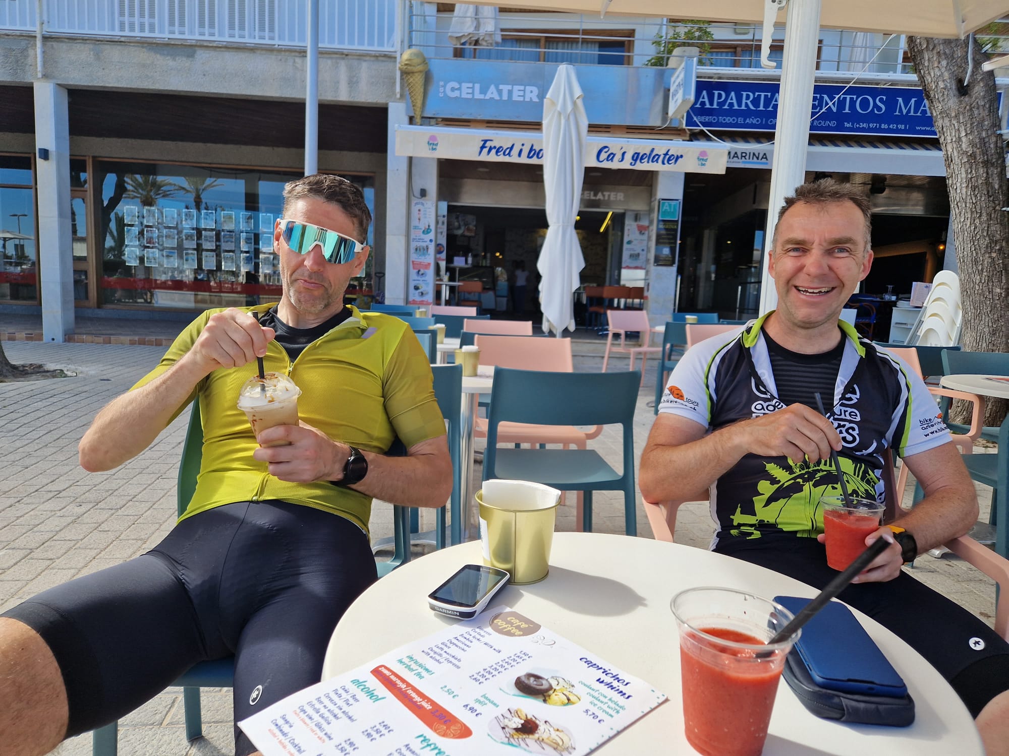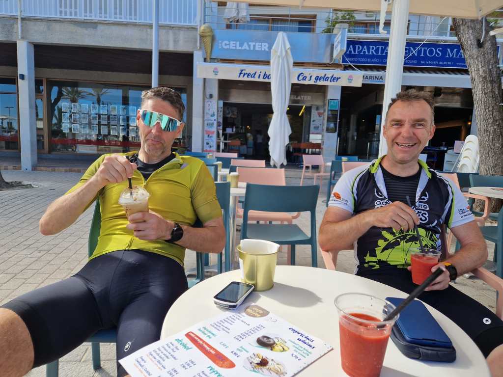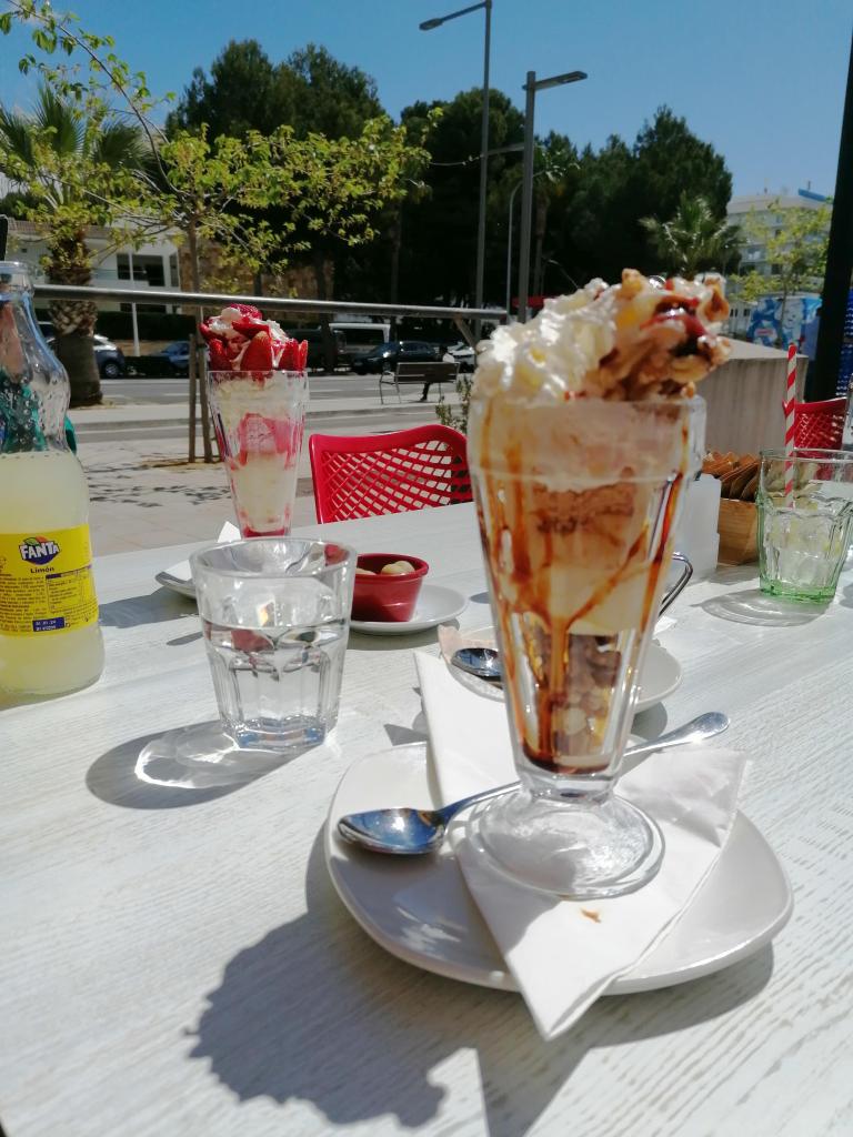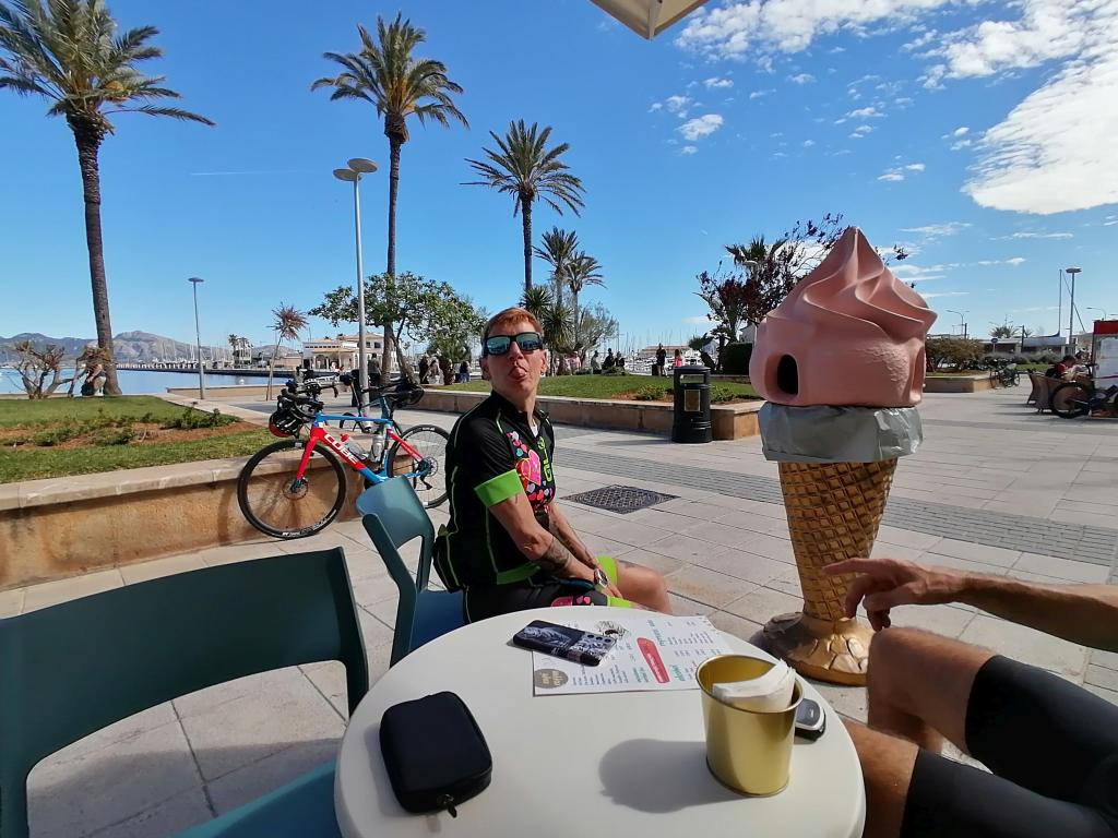 Unseren Ruhetag wählten wir angepasst an den Wetterbericht und somit etwas spät erst am siebten Tag unseres Aufenthaltes. Wir zogen an diesem Tag zu Fuss in Alcúdia herum und besuchten diverse Läden mit Velokleidern etc. Im “Dakota Tex Mex – Las Gaviotas”, Erika und Bruno kannten das Lokal beide von früher, gönnten wir uns am Nachmittag ein Eis auf der Terrasse. Da unser “Blüemli” am Folgetag (dem Abschlussvelotag) noch nicht genug Eis hatte, zog es sie in ein Restaurant mit einem “menschengrossen” Cornet.🤩