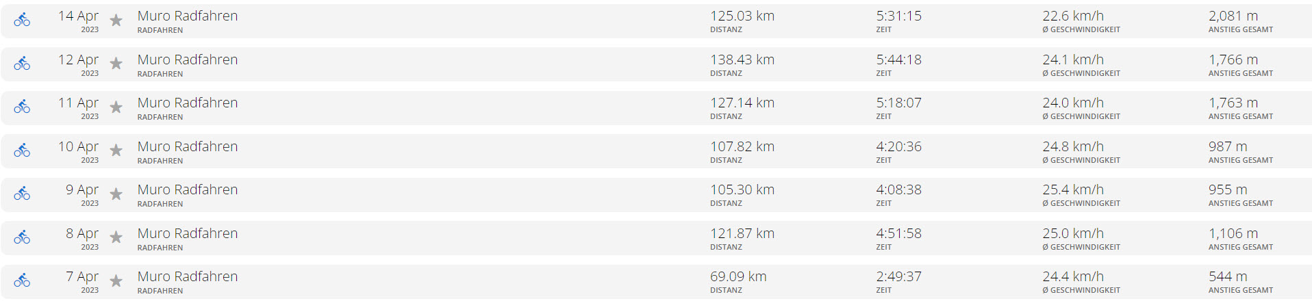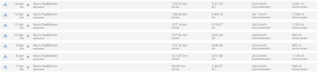 Am ersten Tag starteten wir mit einem gemütlichen 70 km Ausflug und nur wenigen Höhenmetern, aber ideal um uns ans Rad und die schon sommerlichen (AUSSEN-)Temperaturen zu gewöhnen. An den folgenden Tagen legten wir immer zwischen 105 und 138 km in angenehmem Tempo und diversen Zwischenhalten zurück.