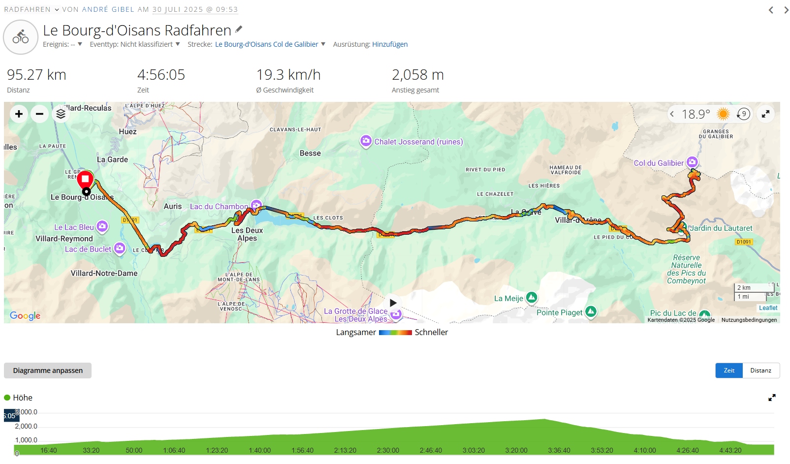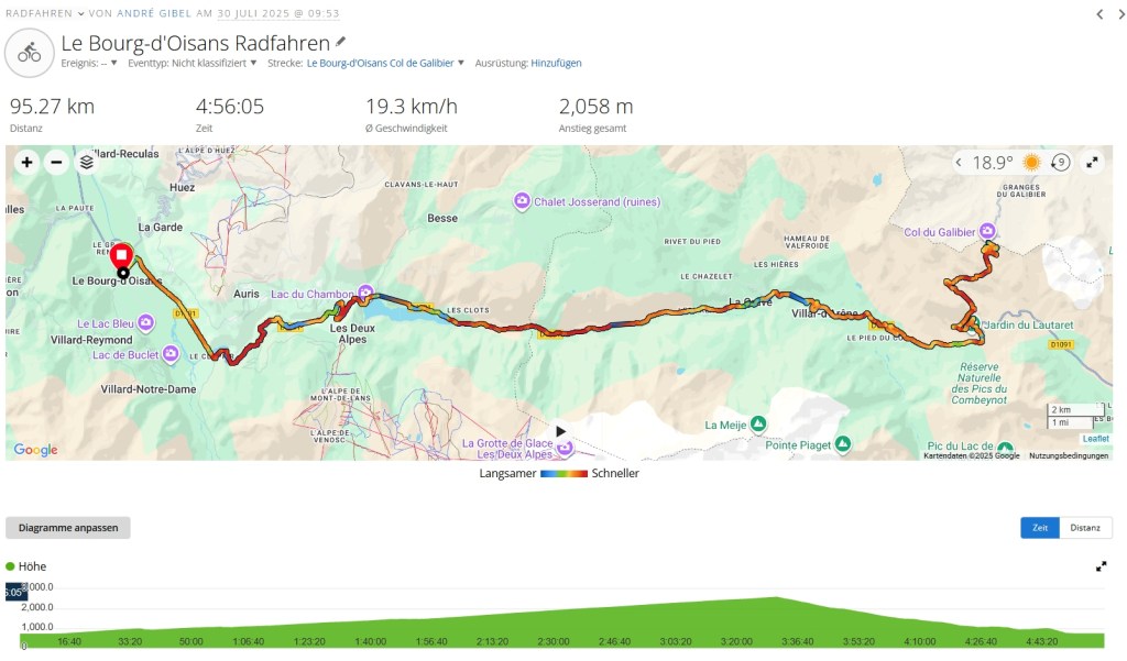 Anlässlich des “Alp d’Huez Duathlon” – an einem Montag und meinem Geburtstag, verbrachte ich fast eine Woche in Le Bourg d’Oisans. Dies ist ein super Ausgangspunkt für viele Radtouren über Alpenpässe, deren Namen man bestens von der Tour de France her kennt. Einer der bekannteren Pässe ist sicher der “Col du Galibier”. Der eigentliche Aufstieg vom Col du Lautaret beträgt nur etwa 9km, doch die Anfahrt über mehr als 40km ist kontinuierlich steigend und zum Schluss folgen die 2 Pässe Col du Lautaret (was nicht wirklich ein Pass ist) und der Galibier als krönender Abschluss. Die ganze Strecke war etwa 95km mit 2’058 Höhenmeter.