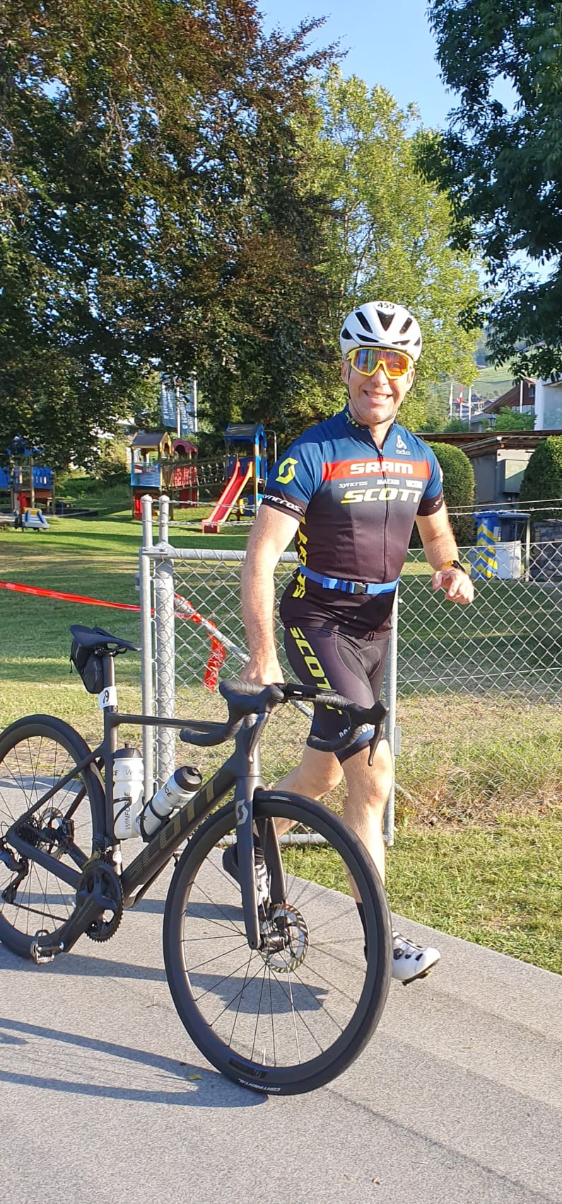 Beim Wechsel von der Radstrecke auf die 2. Laufstrecke rannte ich am falschen Ort auf die Strecke. Es schauten mir etwa 3 Funktionäre zu, aber keiner machte einen Mux! Im Ziel wurde ich disqualifiziert, da ich ein Zeit-Kontrollband nicht passierte. Wenn überhaupt hätte mir der “falsche” Weg einen Zeitvorteil im einstelligen Sekundenbereich gebracht.
